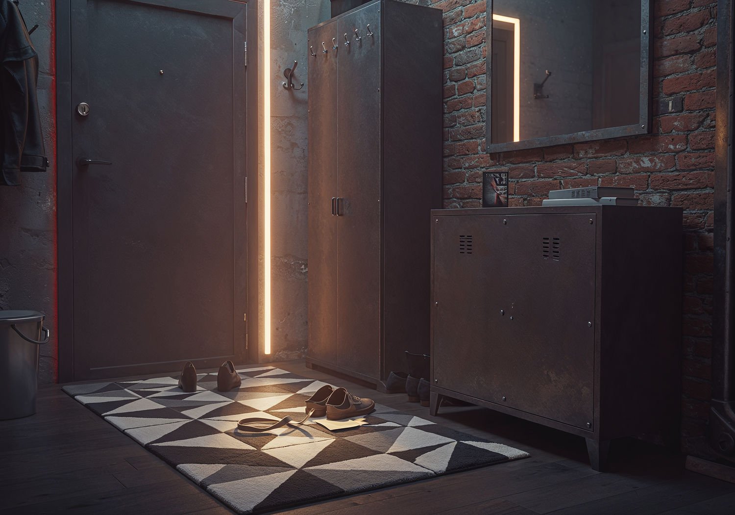 Soft Focus 3D Comic Render, lightly suggestive illustration, vaporwave aesthetic, bold saturation colors, strong use of bright light and transparency, georgeus interior photography: Soft Focus 3D Comic Render, lightly suggestive illustration, vaporwave aesthetic, bold saturation colors, strong use of bright light and transparency, georgeus interior photography: A modern industrial-style hallway entrance featuring a non-slip rug with bold geometric patterns in black, white, and gray tones covering the floor near the door. The rug is placed in front of a sleek metal shoe cabinet with visible screws and matte finish, and beside a large mirror in a corten steel frame hanging on a exposed brick wall. Subtle details include a pair of removed shoes on the rug, a metal coat hook nearby, and soft LED lighting overhead casting shadows that highlight the rug’s triangular and hexagonal motifs, creating a welcoming and protected entry space. ;Image without icons or texts. Style: volumetric light, high gloss finish, artistic style, shallow depth of field, dreamlike atmosphere. ;Image without icons or texts. Style: volumetric light, high gloss finish, artistic style, shallow depth of field, dreamlike atmosphere.