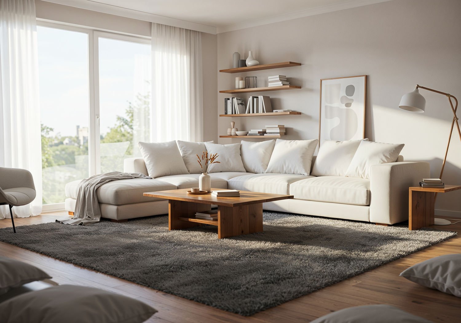 Soft Focus 3D Comic Render, lightly suggestive illustration, vaporwave aesthetic, bold saturation colors, strong use of bright light and transparency, georgeus interior photography: Soft Focus 3D Comic Render, lightly suggestive illustration, vaporwave aesthetic, bold saturation colors, strong use of bright light and transparency, georgeus interior photography: A cozy modern living room with a large shaggy rug in subtle shades of gray covering most of the floor as the central element, a white minimalist modular sofa positioned on the rug, a wooden coffee table with warm brown tones placed in front, natural light streaming through large windows, scattered white cushions and wooden accents like shelves and a lamp, evoking warmth and family comfort. ;Image without icons or texts. Style: volumetric light, high gloss finish, artistic style, shallow depth of field, dreamlike atmosphere. ;Image without icons or texts. Style: volumetric light, high gloss finish, artistic style, shallow depth of field, dreamlike atmosphere.
