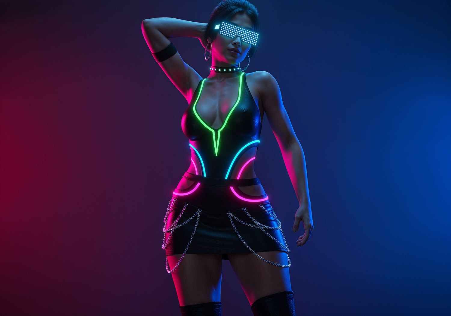 Soft Focus 3D Comic Render, lightly suggestive illustration, vaporwave aesthetic, smooth skin texture, soft curves on young busty women, very low saturation colors, strong use of bright light and transparency: Soft Focus 3D Comic Render, lightly suggestive illustration, vaporwave aesthetic, smooth skin texture, soft curves on young busty women, very low saturation colors, strong use of bright light and transparency: A confident woman posing dynamically in a dimly lit techno club, wearing a form-fitting black body with neon lime, pink, and blue glowing cutouts exposing her cleavage, stomach, and sides in zigzag and geometric patterns; a short black leather mini skirt with asymmetric silver and neon chains dangling from the hips; futuristic cat-eye glasses with flashing RGB LED lights on neon frames; and black patent platform heels with glowing neon soles; her skin highlighted by UV lights and lasers reflecting off the chains and cutouts, hair pinned up high, neon makeup on eyes and exposed skin. ;Image without icons or texts. Style: showing of beauty of the body and skin, showing of stomach, hips, legs, arms, deep neckline with push-up effect, skimpy outfit, volumetric light, high gloss finish, artistic style, shallow depth of field, dreamlike atmosphere. ;Image without icons or texts. Style: showing of beauty of the body and skin, showing of stomach, hips, legs, arms, deep neckline with push-up effect, skimpy outfit, volumetric light, high gloss finish, artistic style, shallow depth of field, dreamlike atmosphere.