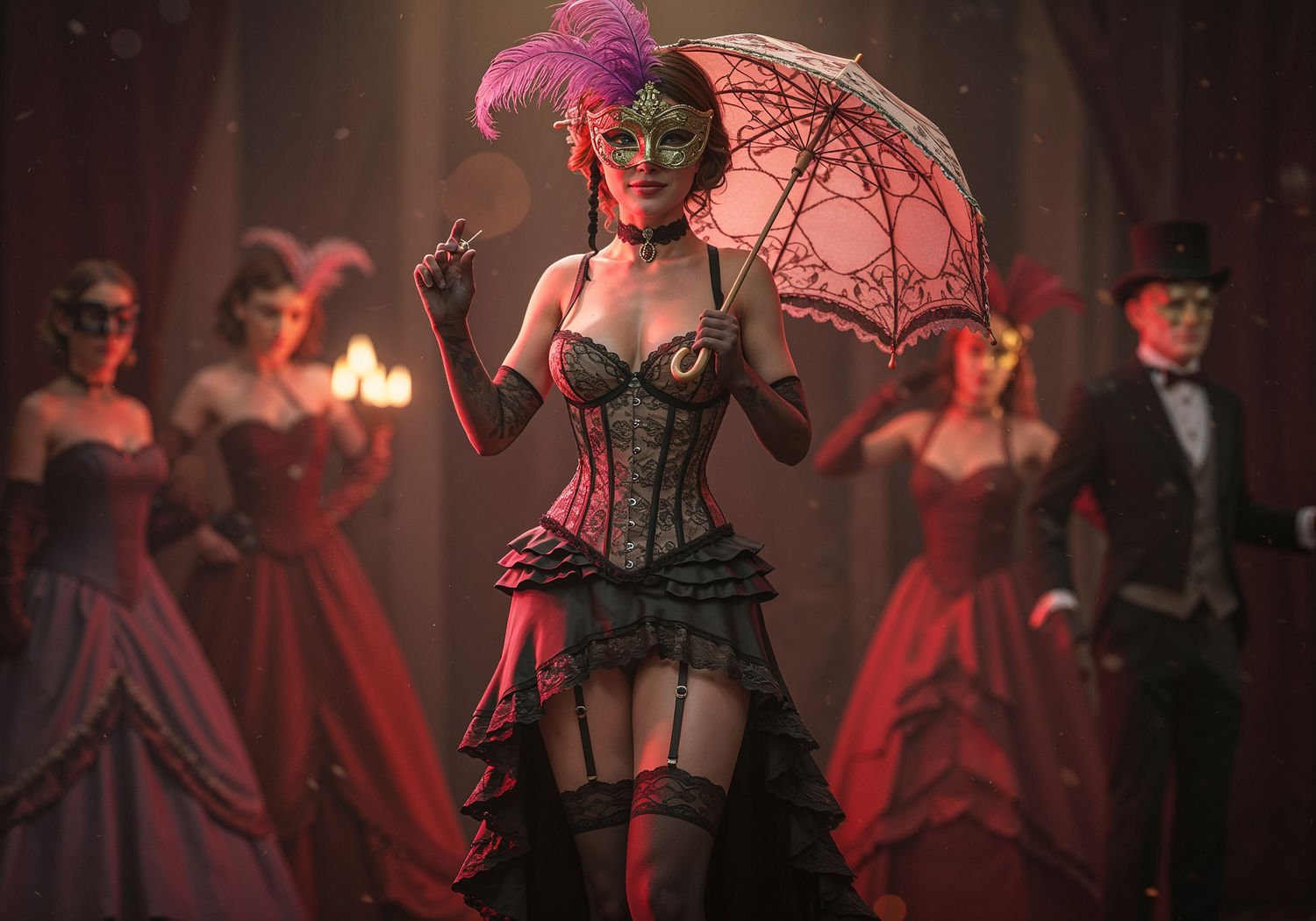 Soft Focus 3D Comic Render, lightly suggestive illustration, vaporwave aesthetic, smooth skin texture, soft curves on young busty women, very low saturation colors, strong use of bright light and transparency: Soft Focus 3D Comic Render, lightly suggestive illustration, vaporwave aesthetic, smooth skin texture, soft curves on young busty women, very low saturation colors, strong use of bright light and transparency: A woman embodying a Victorian coquette at a masquerade ball, wearing a lace corset that cinches her waist and accentuates her décolleté, a long skirt with a high front slit revealing her thigh as she steps forward gracefully, elbow-length sheer gloves covering her arms, holding a delicate parasol in one hand, a feathered Venetian mask partially covering her face with a mysterious smile, surrounded by dimly lit ballroom with other masked figures in the background, her posture elegant yet subtly provocative. ;Image without icons or texts. Style: showing of beauty of the body and skin, showing of stomach, hips, legs, arms, deep neckline with push-up effect, skimpy outfit, volumetric light, high gloss finish, artistic style, shallow depth of field, dreamlike atmosphere. ;Image without icons or texts. Style: showing of beauty of the body and skin, showing of stomach, hips, legs, arms, deep neckline with push-up effect, skimpy outfit, volumetric light, high gloss finish, artistic style, shallow depth of field, dreamlike atmosphere.