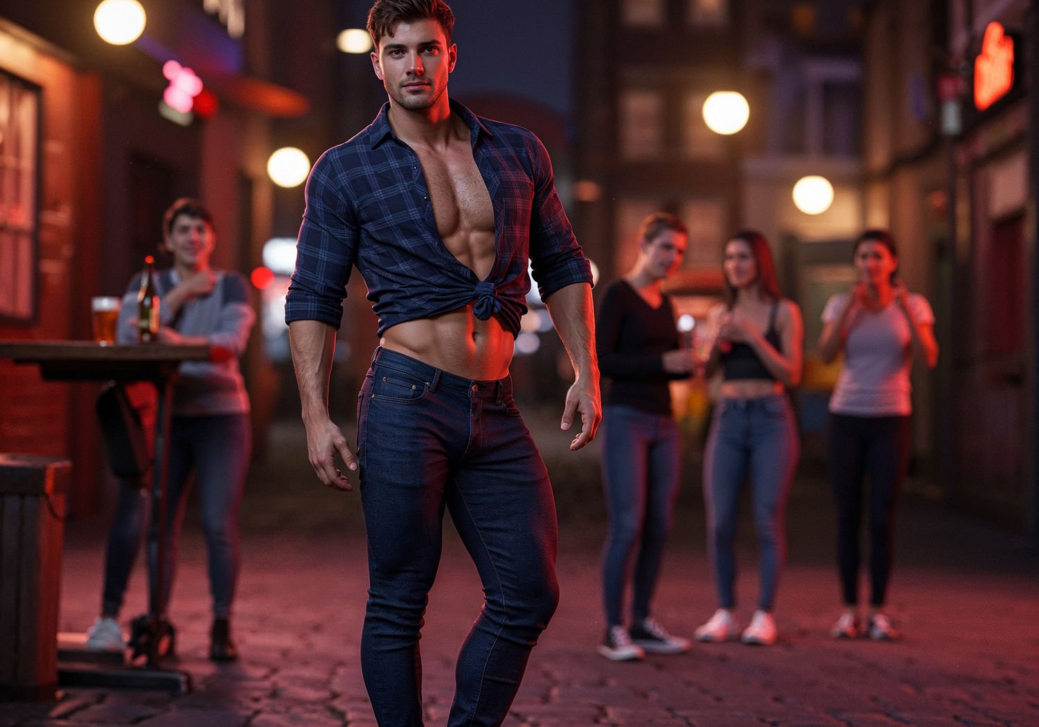 Soft Focus 3D Comic Render, lightly suggestive illustration, vaporwave aesthetic, smooth skin texture, soft curves on young busty women, very low saturation colors, strong use of bright light and transparency: Soft Focus 3D Comic Render, lightly suggestive illustration, vaporwave aesthetic, smooth skin texture, soft curves on young busty women, very low saturation colors, strong use of bright light and transparency: A confident athletic man with a V-shaped torso and defined biceps wearing a fitted navy plaid shirt partially tucked in, slim dark indigo jeans, and white low-top sneakers, standing relaxed in a casual evening urban setting with friends laughing nearby at a pub or city street, half-tuck style emphasizing his physique, natural pose highlighting the outfit’s casual elegance. ;Image without icons or texts. Style: showing of beauty of the body and skin, showing of stomach, hips, legs, arms, deep neckline with push-up effect, skimpy outfit, volumetric light, high gloss finish, artistic style, shallow depth of field, dreamlike atmosphere. ;Image without icons or texts. Style: showing of beauty of the body and skin, showing of stomach, hips, legs, arms, deep neckline with push-up effect, skimpy outfit, volumetric light, high gloss finish, artistic style, shallow depth of field, dreamlike atmosphere.