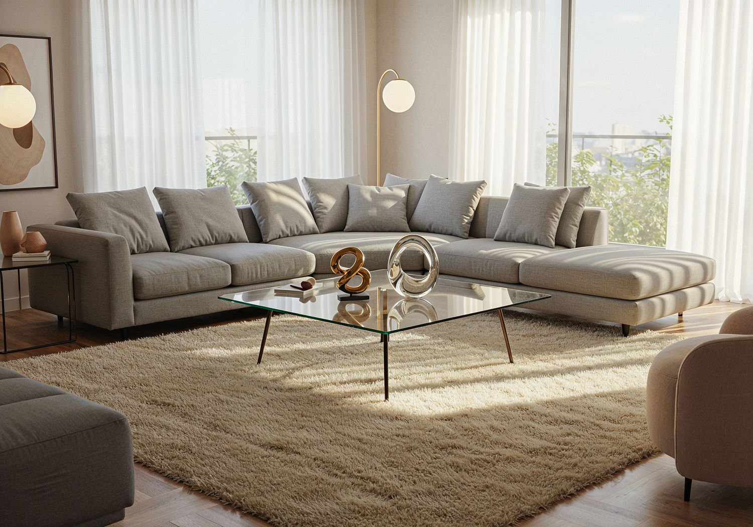 Soft Focus 3D Comic Render, lightly suggestive illustration, vaporwave aesthetic, bold saturation colors, strong use of bright light and transparency, georgeus interior photography: Soft Focus 3D Comic Render, lightly suggestive illustration, vaporwave aesthetic, bold saturation colors, strong use of bright light and transparency, georgeus interior photography: A cozy modern living room featuring a large cream-colored shaggy rug covering the floor under a modular gray L-shaped corner sofa positioned centrally. In front of the sofa, a transparent glass coffee table with slim metal legs partially sinking into the rug’s plush pile, topped with two minimalist abstract sculptures—one twisted bronze form and one matte glass organic shape. Soft natural light filters through large windows, highlighting the rug’s fluffy texture and creating warm shadows around the furniture, evoking a sense of relaxation and luxury. ;Image without icons or texts. Style: volumetric light, high gloss finish, artistic style, shallow depth of field, dreamlike atmosphere. ;Image without icons or texts. Style: volumetric light, high gloss finish, artistic style, shallow depth of field, dreamlike atmosphere.
