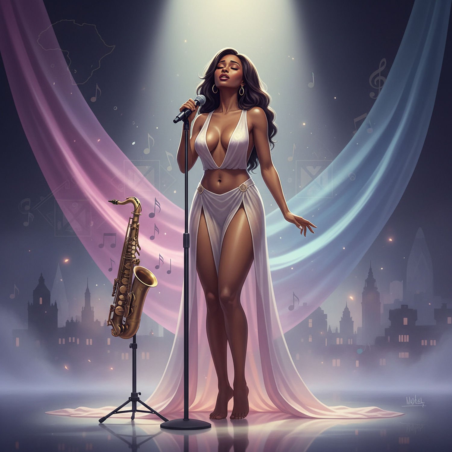 Soft Focus 3D Comic Render, lightly suggestive illustration, vaporwave aesthetic, smooth skin texture, soft curves on young busty women, very low saturation colors, strong use of bright light and transparency: Soft Focus 3D Comic Render, lightly suggestive illustration, vaporwave aesthetic, smooth skin texture, soft curves on young busty women, very low saturation colors, strong use of bright light and transparency: Sade Adu standing elegantly on a dimly lit stage, microphone in hand, her eyes closed in deep emotion as she sings, surrounded by subtle jazz elements like a saxophone resting nearby, soft flowing silk fabrics draping the background, hints of African patterns and London cityscape silhouettes blending in the mist, evoking a serene atmosphere of love and longing. ;Image without icons or texts. Style: showing of beauty of the body and skin, showing of stomach, hips, legs, arms, deep neckline with push-up effect, skimpy outfit, volumetric light, high gloss finish, artistic style, shallow depth of field, dreamlike atmosphere. ;Image without icons or texts. Style: showing of beauty of the body and skin, showing of stomach, hips, legs, arms, deep neckline with push-up effect, skimpy outfit, volumetric light, high gloss finish, artistic style, shallow depth of field, dreamlike atmosphere.
