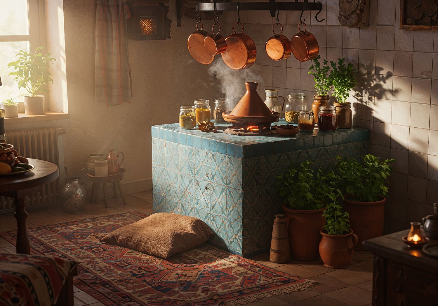 Soft Focus 3D Comic Render, lightly suggestive illustration, vaporwave aesthetic, bold saturation colors, strong use of bright light and transparency, georgeus interior photography: Soft Focus 3D Comic Render, lightly suggestive illustration, vaporwave aesthetic, bold saturation colors, strong use of bright light and transparency, georgeus interior photography: A cozy Moroccan-inspired kitchen corner with a handwoven Berber rug in geometric patterns of terracotta, indigo, and cream covering the floor under a central kitchen island tiled in intricate blue-green zellige mosaic. On the island sits a traditional clay tagine pot steaming with aromatic spices like ras el hanout, surrounded by copper pots hanging from a rack above, jars of colorful spices, and pots of fresh green herbs such as mint and cilantro. Bare feet stand on the soft rug near the island, with subtle steam rising and warm light filtering in, evoking a sensory cooking experience. ;Image without icons or texts. Style: volumetric light, high gloss finish, artistic style, shallow depth of field, dreamlike atmosphere. ;Image without icons or texts. Style: volumetric light, high gloss finish, artistic style, shallow depth of field, dreamlike atmosphere.