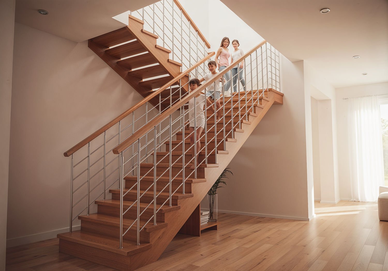 Soft Focus 3D Comic Render, lightly suggestive illustration, vaporwave aesthetic, smooth skin texture, soft curves on young busty women, very low saturation colors, strong use of bright light and transparency: A modern open-plan living space in a contemporary home featuring a sleek wooden staircase with harp-style balustrade made of thin vertical stainless steel rods spaced evenly like harp strings, connected to a smooth wooden handrail at the top and integrated base at the bottom; natural light streams through large windows, illuminating the airy structure; a young family with children ascends the stairs safely, emphasizing elegance and spaciousness; subtle integration with minimalist furniture and neutral walls in the background. ;Image without icons or texts. Style: showing of beauty of the body and skin, showing of stomach, hips, legs, arms, deep neckline with push-up effect, skimpy outfit, volumetric light, high gloss finish, artistic style, shallow depth of field, dreamlike atmosphere.